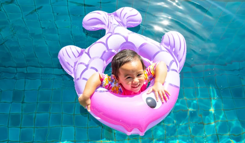 เล่นน้ำหรือว่ายน้ำ ควรเลือกชุดว่ายน้ำที่มีแขนและขายาว จะช่วยป้องกันแดดได้ดีกว่าชุดว่ายน้ำน้อยชิ้น และในเวลาที่ลูกๆ ต้องนั่งเล่นทรายริมหาด หันหลังให้ดวงอาทิตย์ ใส่กางเกงว่ายน้ำตัวเดียวเอาไม่อยู่แน่ค่ะ แดดบ้านเราแรงจริงๆ (เดี๋ยวนี้ชุดว่ายน้ำสำหรับเด็ก เนื้อผ้าของชุดว่ายน้ำจะสามารถกัน UV ได้ จะระบุไว้ประมาณว่า UPF 40+ protects skin from the sun) แสงแดดในเวลากลางวัน ไม่ว่าจะมีแสงแดดส่องหรือไม่ก็ตาม ทรายตามชายหาดหรือทะเลทรายจะสะท้อนรังสี UV ประมาณ 15% ขณะที่ผิวน้ำสะท้อนประมาณ 5% เลยนะคะ