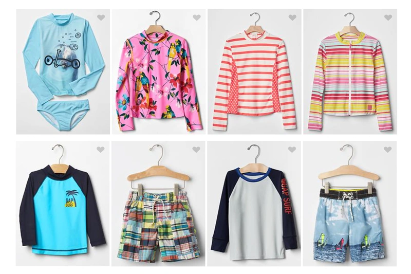 เล่นน้ำหรือว่ายน้ำ ควรเลือกชุดว่ายน้ำที่มีแขนและขายาว จะช่วยป้องกันแดดได้ดีกว่าชุดว่ายน้ำน้อยชิ้น และในเวลาที่ลูกๆ ต้องนั่งเล่นทรายริมหาด หันหลังให้ดวงอาทิตย์ ใส่กางเกงว่ายน้ำตัวเดียวเอาไม่อยู่แน่ค่ะ แดดบ้านเราแรงจริงๆ (เดี๋ยวนี้ชุดว่ายน้ำสำหรับเด็ก เนื้อผ้าของชุดว่ายน้ำจะสามารถกัน UV ได้ จะระบุไว้ประมาณว่า UPF 40+ protects skin from the sun) แสงแดดในเวลากลางวัน ไม่ว่าจะมีแสงแดดส่องหรือไม่ก็ตาม ทรายตามชายหาดหรือทะเลทรายจะสะท้อนรังสี UV ประมาณ 15% ขณะที่ผิวน้ำสะท้อนประมาณ 5% เลยนะคะ